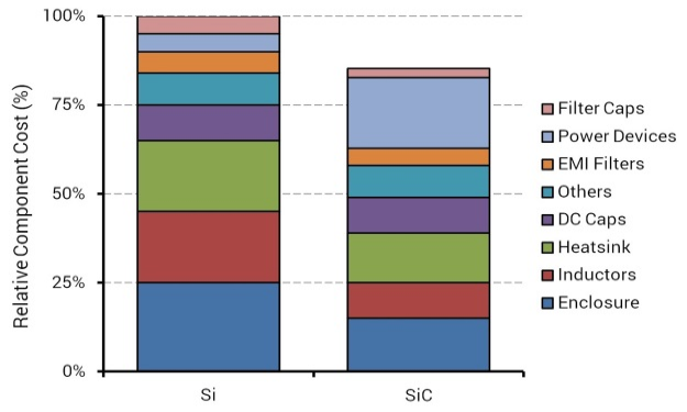 其次,盡管碳化硅器件的成本比硅基IGBT高,但是由于節(jié)省無源元器件、冷卻系統(tǒng)等成本,整體主驅(qū)逆變器的系統(tǒng)綜合成本卻比硅基方案系統(tǒng)成本更低。