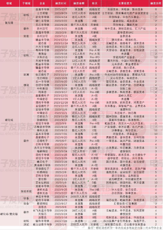 第三代半導(dǎo)體是以碳化硅、氮化鎵等為代表的寬禁帶半導(dǎo)體材料。某機(jī)構(gòu)數(shù)據(jù)顯示,2022年,國內(nèi)有超26家碳化硅企業(yè)拿到融資。今年光上半年就有32家碳化硅企業(yè)拿到融資。2023全年第三代半導(dǎo)體行業(yè)融資超62起。具體如下: