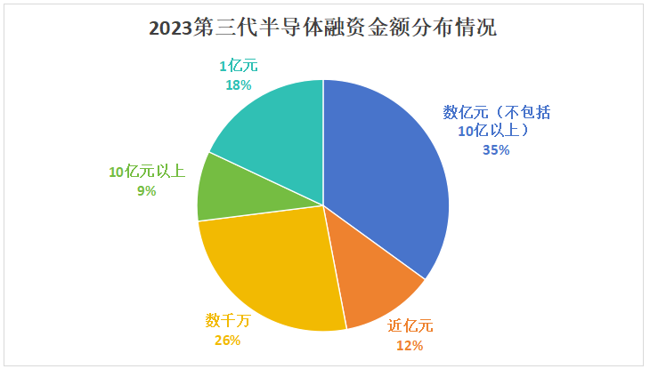 在融資輪次中,2023年第三代半導(dǎo)體企業(yè)最多的是戰(zhàn)略投資、A輪和B輪融資,分別占總?cè)谫Y事件的比例為23%、19%、15%。第三代半導(dǎo)體行業(yè)早期融資特征較為明顯,這跟產(chǎn)業(yè)發(fā)展仍處于早期階段有關(guān)。