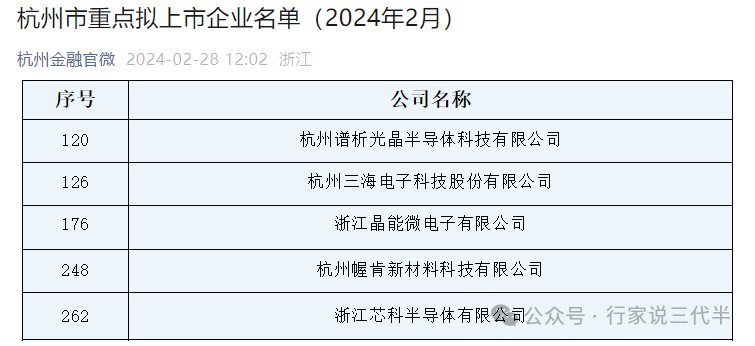 近日,杭州市委金融委員會(huì)辦公室等單位公布了杭州市重點(diǎn)擬上市企業(yè)名單(2024年2月),仔細(xì)瀏覽發(fā)現(xiàn),該名單中中包括5家SiC相關(guān)企業(yè)。